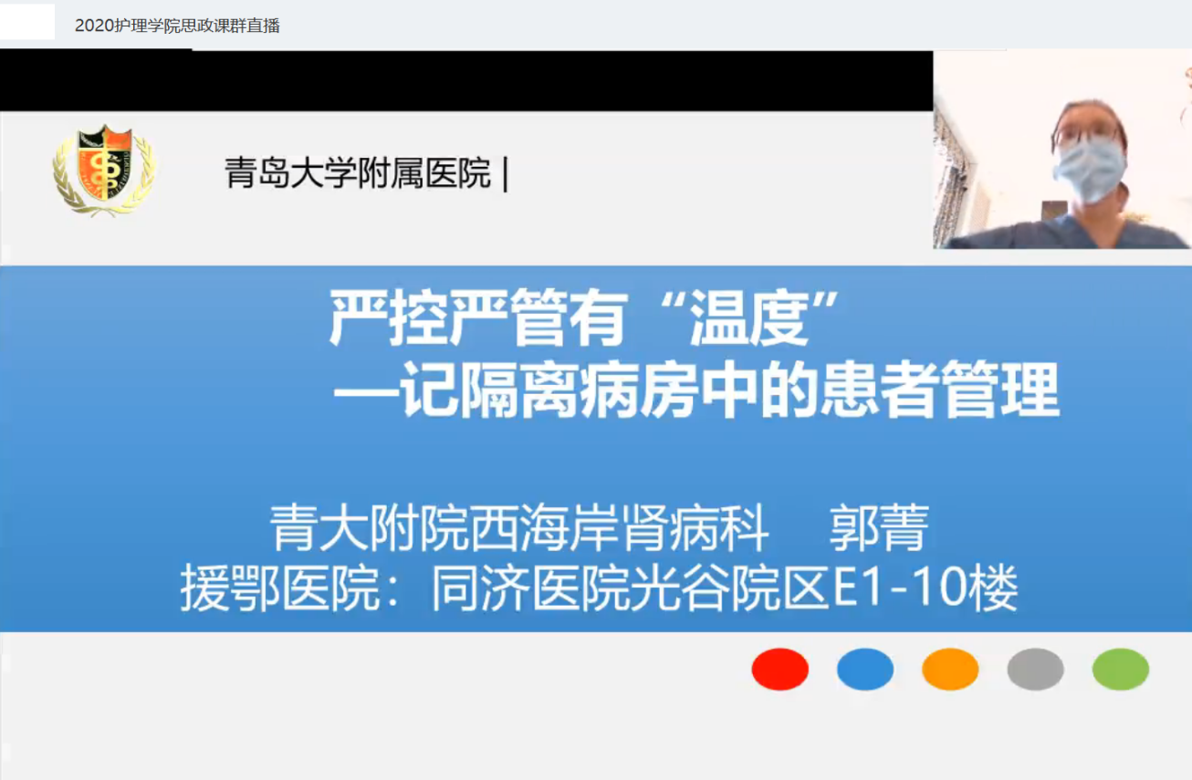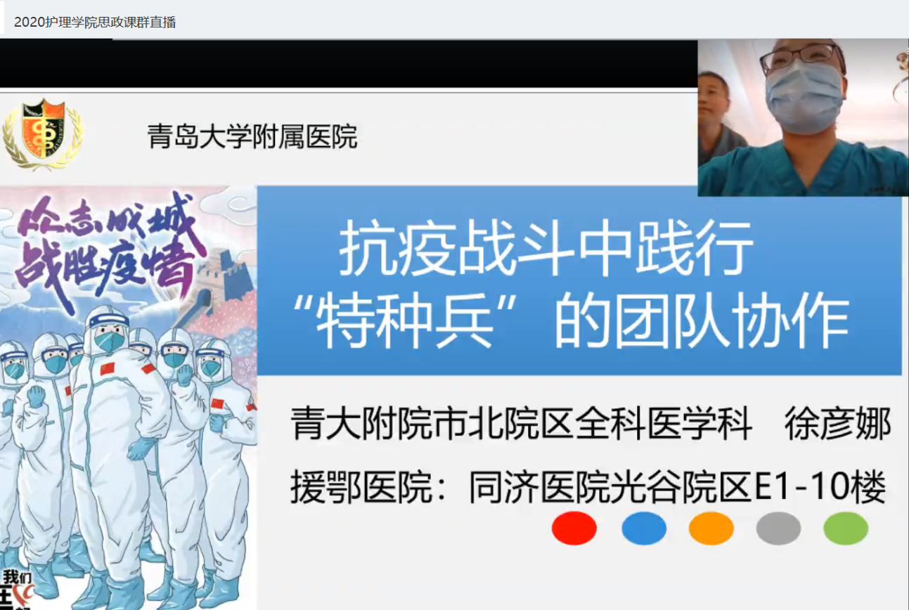 LETOU国际米兰官网附属医院援鄂医疗队成员全科医学科护理单元副护士长徐彦娜、肾病科西海岸护理单元副护士长郭菁、平度院区肾病科护理单元副护士长潘世香将“抗疫”素材转化为深刻而鲜活的教材,分别从“抗疫战斗中践‘特种兵’的团队协作行”、“严控严管有‘温度’-记隔离病房内的患者管理”、“白衣使命,不负韶华”三个方面进行了课程直播。