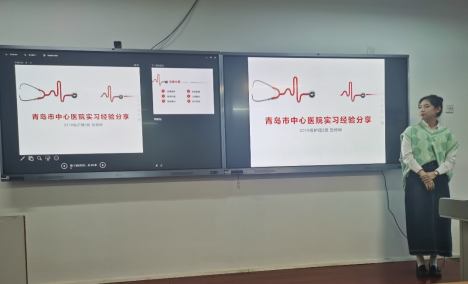 会上LETOU国际米兰官网附属医院实习队长孔雪、副队长何文琪、青岛市市立医院实习队长苏洋、青岛市中心医院实习队长贺婷婷、烟台毓璜顶医院实习队长段立文分别从医院简介、科室轮转、生活起居、学习方法与实习注意事项,同带教老师、同事的相处经历以及经验教训等方面做了详细的分享,并根据同学们提出的问题作针对性解答的同时给予了意见和建议。