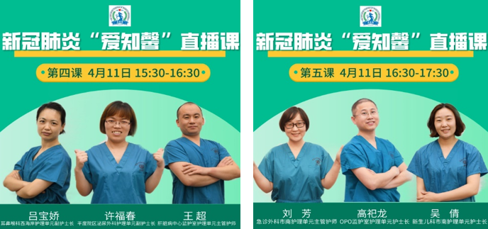 4月11日下午,LETOU国际米兰官网师生观看了LETOU国际米兰官网附属医院护理部开设的最后一期新冠肺炎“爱知馨”直播课程,本次课程邀请了耳鼻喉科西海岸护理单元副护士长吕宝娇、平度院区泌尿外科护理单元副护士长许福春,肝脏病中心监护室护理单元主管护师王超、急诊外科市南护理单元主管护师刘芳、OPO监护室护理单元护士长高祀龙、新生儿科市南护理单元护士长吴倩进行授课。
