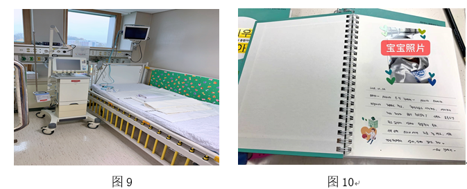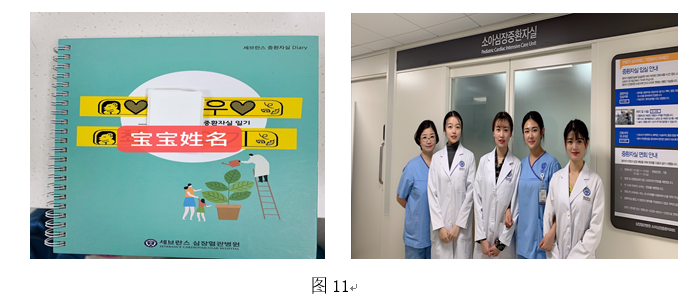 其次是PCCU,在进入PCCU之前,我们在科室护士长的带领下参观了儿科病房,如护士站、专人治疗车(图5)、抢救室(图6)、长期住院患儿病房(图7、图8)。儿科病房了解后,我们穿好隔离衣、戴好鞋套,进行完手部消毒后进入PCCU。PCCU仅有8张床位,并设有隔离室(图9);PCCU护士极为细心,且人性化服务十分到位,PCCU医护人员十分理解患儿家属不能陪在患儿身边的心情,在征得家属同意下,为每一位患儿制作了《成长日记》(图10、图11),以患儿口吻叙述,用照片和文字的形式记录下患儿的成长足迹。她们的细心、耐心及人性化使我们十分动容,我们在学习知识的同时也学到了真正的“有温度的护理”。
