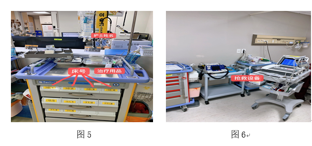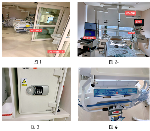 随后护士长与专科护士向我们介绍了病房的相关设备,如负压病房(见图1),该病房为双门设置,压力控制器在门口,护士可在两门之间区域进行衣物的更换,两重门不会同时开放,以降低患者感染的风险;普通病房(见图2),该病房的监护仪、氧气装置、吸痰装置等安装在可移动架上,以方便患者抢救,电脑显示屏为双屏,使得护士同时观察两病人病情,为护士提供工作便利;病床(见图3)为全自动设备,可根据患者病情升降病床,且设有CPR模式,一旦患者需要抢救,可将病床调至CPR模式,立即进行心肺复苏;科室危险物品保存在密码柜(见图4)中,密码柜设有密码。