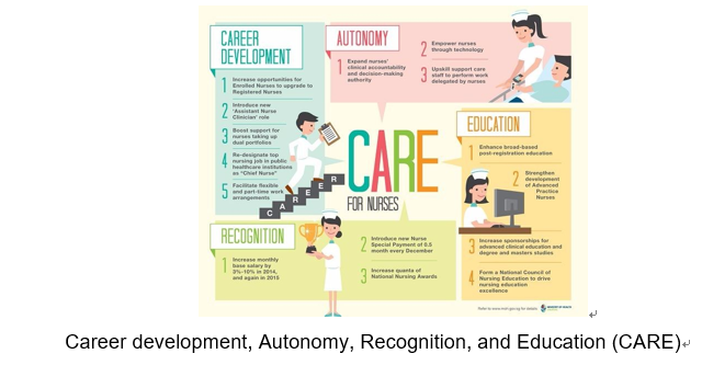 另外培训中提到了新加坡为了留住护理人才而建立的组织National Nursing Taskforce (Care for nurse),组织设计四大方面分别是Career development (职业发展)、Autonomy (自主决策)、Recognition (认证)、Education(教育)(医生越来越专科,这是弊端,护士就需要变得全科,将病人看作一个整体,才能平衡医疗体系。“自主决策”是指扩大护士的临床问责和决策权力,通过技术赋予护士权力,而教育方面则指出医生越来越专科,这是弊端,护士就需要变得全科,将病人看作一个整体,才能平衡医疗体系,这也是新加坡及其重视APN (Advanced Practice Nurse)的培养的原因。