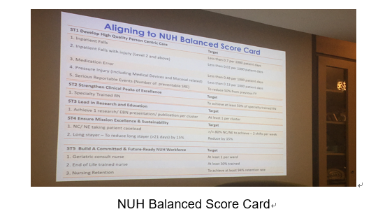 新加坡国立医院 (NUH)的护理部主任黄女士给我们呈现了医院对于护士的核心价值的要求为正直(Integrity)、以病人为中心 (Patient-Centeredness)、合作(Teamwork)、尊重 (Respect)、同情心 (Compassion)、优秀(Excellence),但是黄主任指出,优质护理是护理职业道德的基础,因此国立医院对于患者安全管理方面极为严格,我国实行的5S的病房管理包括整理(SEIRI)、整顿(SEITON)、清扫(SEISO)、清洁(SEIKETSU)、素养(SHITSUKE),国立医院对其进行改进,加入患者安全 (SAFE),实行6S管理。并且为给患者提供更加优质的护理,国立医院制定了“NUH Balanced Score Card”,根据卡片内容每年对每个科室进行考核,并且每年的考核内容会根据去年的情况进行修改。