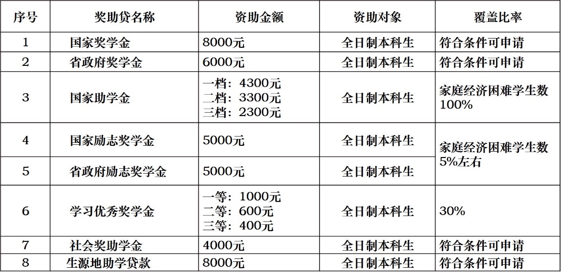 设有国家奖助学金、国家助学贷款、校长奖学金、勤工助学、特殊困难补助、建档立卡学费减免、新生入学“绿色通道”等多种方式的混合奖助育人体系。