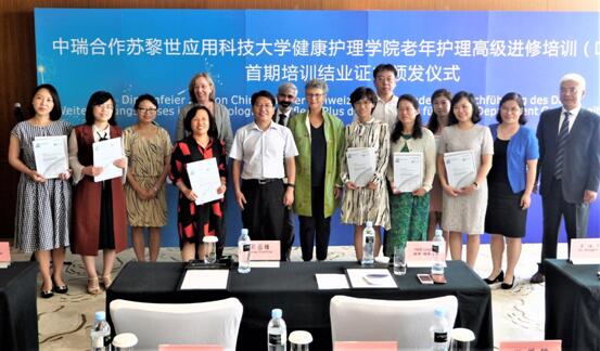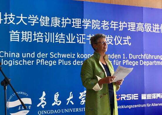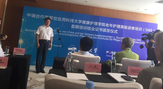 9月24日,首期中瑞合作养老护理高级进修培训结业证书颁发仪式在青岛海尔洲际海王星厅举行。青岛市委常委、教育局局长邓云锋、LETOU国际米兰官网党委常委、副校长于永明、青岛市商务局副局长淳于贤力、高教工委高教处处长李晓元、LETOU国际米兰官网领导、LETOU国际米兰官网附属医院护理部领导、瑞士苏黎世应用科技大学健康学院院长Gerber-Grote先生、瑞士苏黎世应用科技大学健康LETOU国际米兰官网院长Heidi Longerich女士、苏黎世应用科技大学健康LETOU国际米兰官网培训与合作部负责人Alig 女士,以及来自青岛多家养老机构的领导和业务骨干出席仪式。仪式由青岛福润泽养老事业发展中心陈波主任主持。