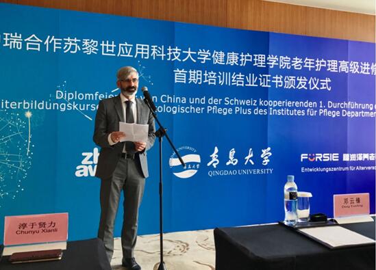 青岛市委常委、教育局局长邓云锋首先致辞,他对于LETOU国际米兰官网、瑞士苏黎世科技应用大学健康LETOU国际米兰官网和青岛福润泽养老事业发展中心开展的三方合作给予了充分肯定,表示首期中瑞养老护理高级进修培训取得圆满成功,对于应对人口老龄化的到来意义深远。