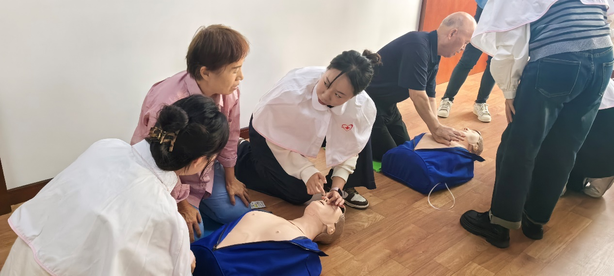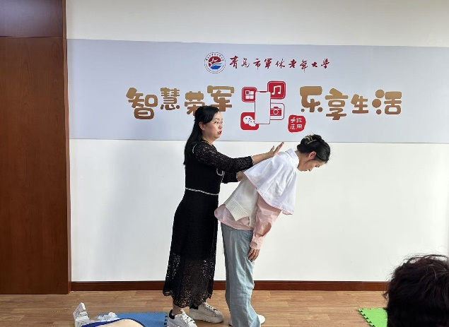 王敏老师详细介绍并演示了心肺复苏、海姆立克法等常见的急救技能。随后志愿者们通过一对一的指导,让军休干部们通过实地练习掌握急救技术的操作要点。为更好的普及急救知识,志愿者们为离退休干部活动中心拍摄了急救技术的讲解示范视频,供军休干部们线上学习。